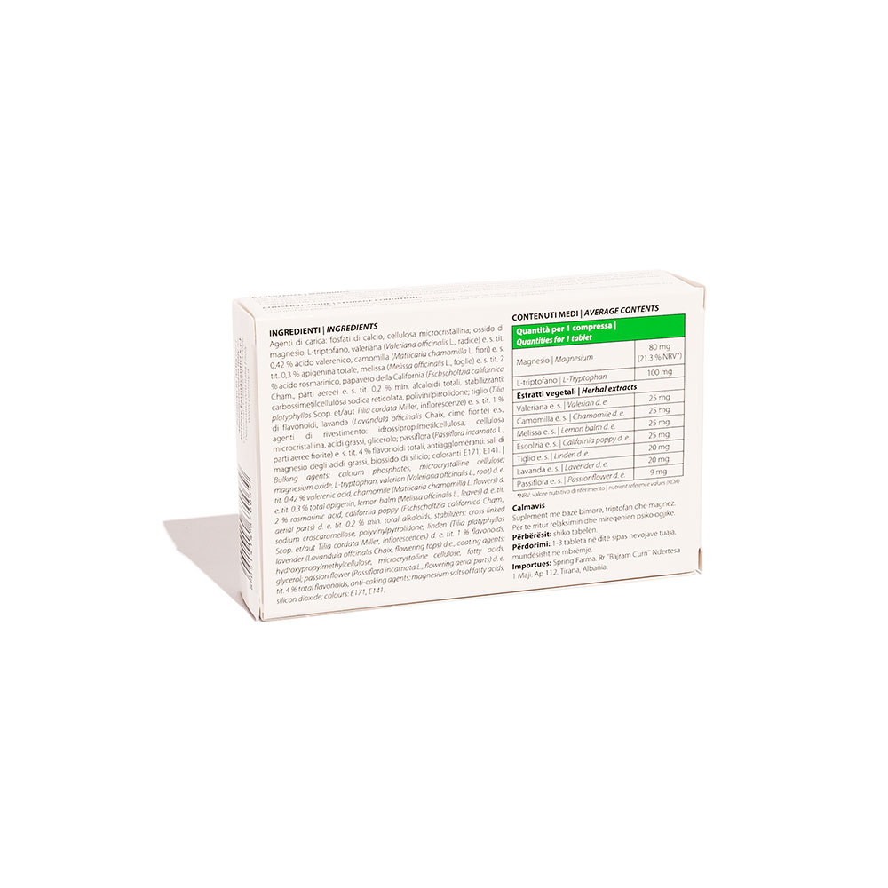 Calmavis është një kombinim me L-triptofan, magnez dhe ekstrakte bimore që mbështesin qetësinë, humorin dhe gjumin. Calmavis, ndryshe nga disa qetësues të tjerë, nuk njihet se ul presionin e gjakut dhe zakonisht tolerohet mirë nga stomaku.
